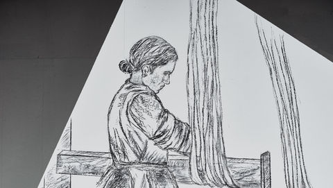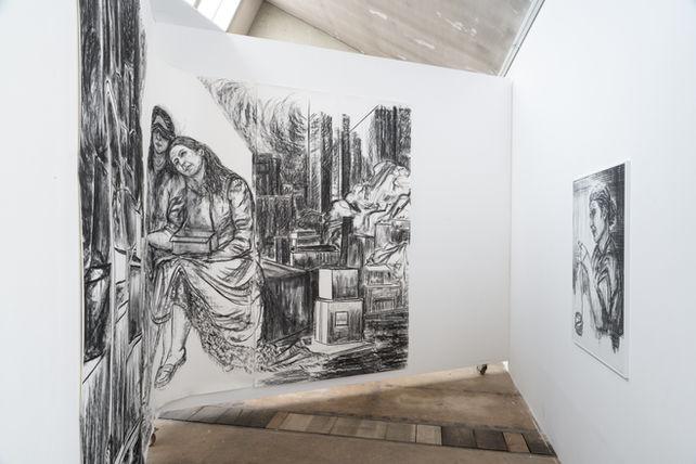 Mit Kohle schafft sie Werke von monumentaler Grösse. Man könnte die Räume, die Ana Vujić mit Architektur und Menschen-darstellungen gestaltet, als eine Art Welttheater lesen. Es zeigt die Welt, die Kräfte und Konventionen, die sie bestimmen, aus einer subjektiven Perspektive.